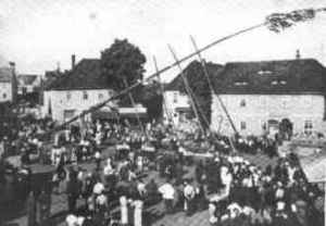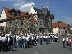 3. Handwerksbrauch - Gesellen und Meister bewiesen im Rahmen eines Maifestes Handwerkskunst ("Anschuhen" des Gipfels an den Stamm) und zeigten den Mädchen, dass sie mit Muskelkraft einen stattlichen Baum (Fichte) aufstellen können. |